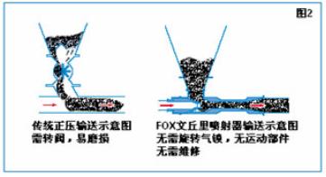 傳統的氣力輸送系統所采用的旋轉閥多有回氣。如果輸送的物料是非常細的或易磨損的,回氣可造成下料不暢以及磨損問題,產生高的維修費用,導致低輸送性能及粉塵飛揚。文丘里噴射器與傳統轉閥相比,最大優點在于無回氣,部件不易磨損,無需維修(見圖2)