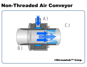 氣力輸送器采用壓縮空氣驅(qū)動(dòng),與標(biāo)準(zhǔn)管、軟管或鋼管相連,可 短 距離有效輸送各種類型的固體顆粒 物料。 使用調(diào)壓器調(diào)節(jié)壓縮空氣壓力,可有效控制物料輸送速度 ,可做為增壓補(bǔ)氣器使用。 工作原理: (A)壓縮空氣由一個(gè)標(biāo)準(zhǔn)NPTF進(jìn)氣口A,流入并充滿整個(gè)環(huán)型氣室。 (B)壓縮空氣通過喉口處噴嘴C以高速噴出,在負(fù)壓端B產(chǎn)生高真空。 (C)負(fù)壓吸入物料并加速通過氣力輸送器,可以輸送相當(dāng)長的水平或垂直距離。
